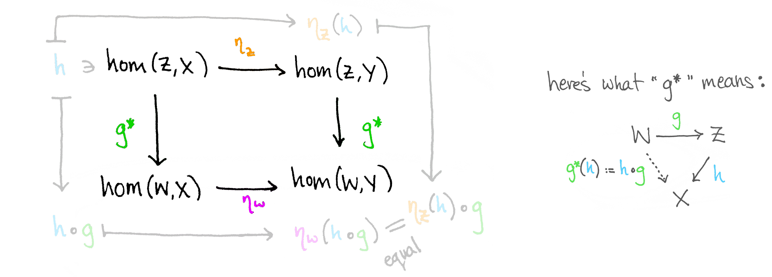 $$ \begin{tikzcd} B \arrow[d, “f”] & g: A \to X \arrow[rr, “j \circ -”] \arrow[d, “- \circ f”] & & j \circ g: A \to Y \arrow[d, “- \circ f”] \ A & g \circ f: B \to X \arrow[rr, “j \circ -”] & & j \circ g \circ f: B \to Y \end{tikzcd} $$