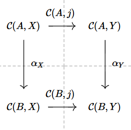 $$ \begin{tikzcd} \mathcal{C}(A, X) \arrow[d, “\alpha_X”] \arrow[r, “\mathcal{C}(A,j)”] & \mathcal{C}(A,Y) \arrow[d, “\alpha_Y”] \\ \mathcal{C}(B,X) \arrow[r, “\mathcal{C}(B,j)”] & \mathcal{C}(B,Y) \end{tikzcd} $$